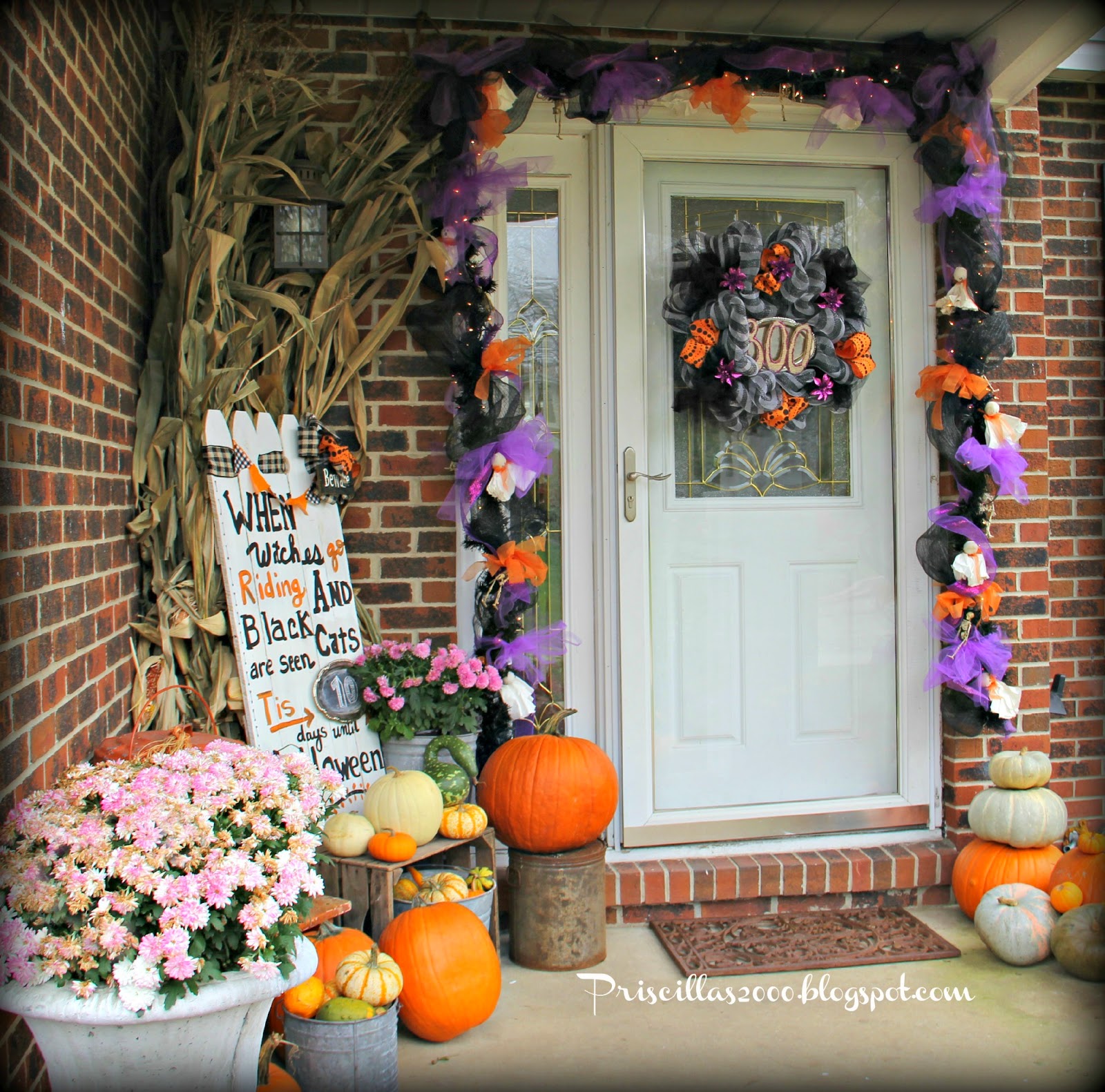 I finally was ready to tke the Fall off the front porch and replace it with Halloween .. I used the same garland and wreath as last year but added more purple tulle bows to the garland..