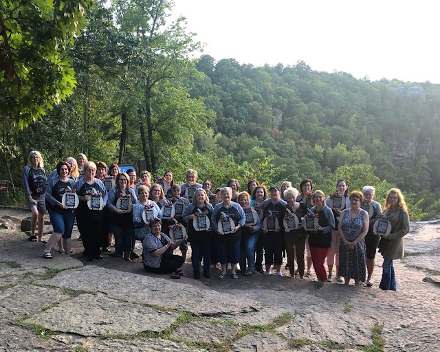 Last Monday Thru Sunday Lela Mae Designs held 2 retreats on Petit Jean Mountain in Arkansas .. we were so excited to be invited to teach a finishing class at each session ! Top photo are the first session attendees with their finished pieces