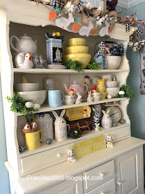 I wanted an open hutch with no doors to showcase my Rae Dunn pieces and I think hutch is perfect for that .. I also added some Vintage chickens .. buffalo checks ..greenery .. eggs ..a nest... a wicker basket and a vintage scale .. black buffalo checks on eggs .. a bunny and some bows tie it all together ..