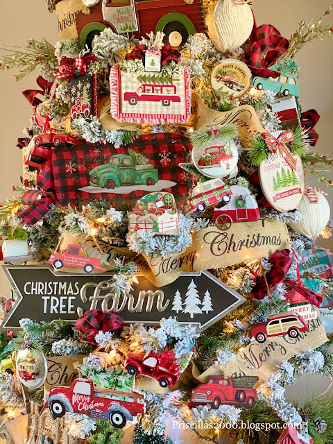 The buffalo plaid with a aqua truck is a serving tray .. my sister in law sent me .. I glued  ribbons to the back to hang it in the tree . The Christmas Tree Farm arrow is from Walmart
